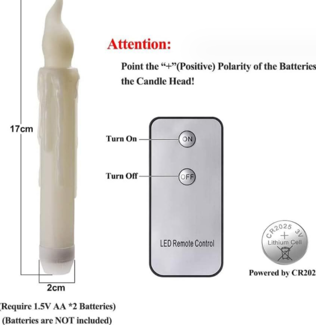 Each candle measures 2.0cm in diameter and 17.0cm in height, while the Magic Stick Remote Control measuzares 2.1cm in diameter and 33.5cm in length. With the 2-key remote control, you can easily control the flashing mode of the candles, adding a touch of enchantment to any setting.