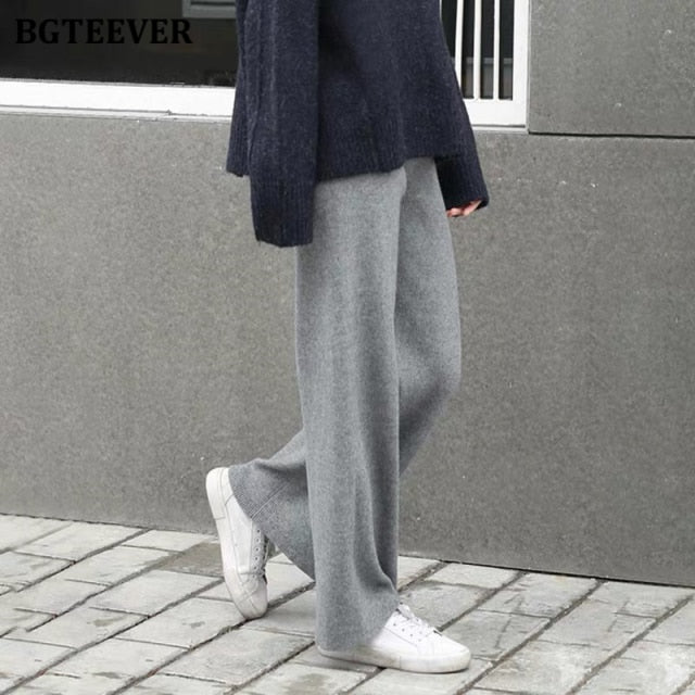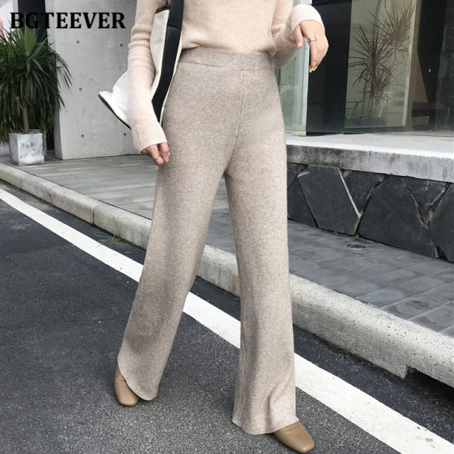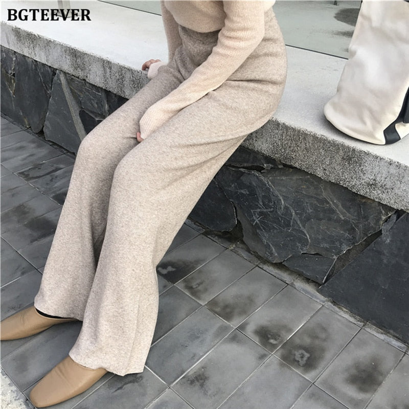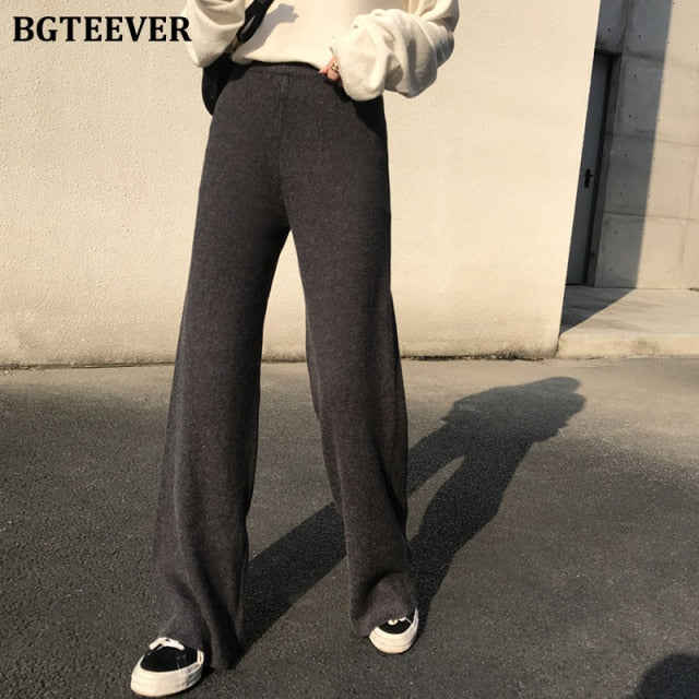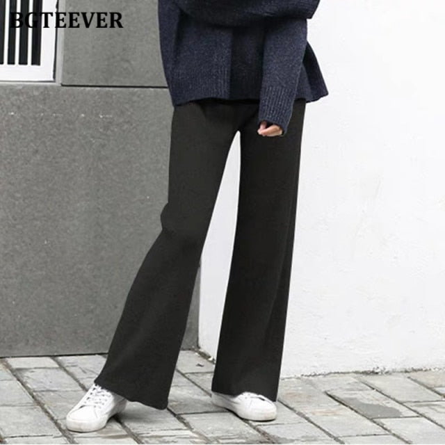 Autumn Winter Women Thick pant Loose Elastic Waist Straight Leg Knitted Long Pant Ladies Casual Sweater Trouser