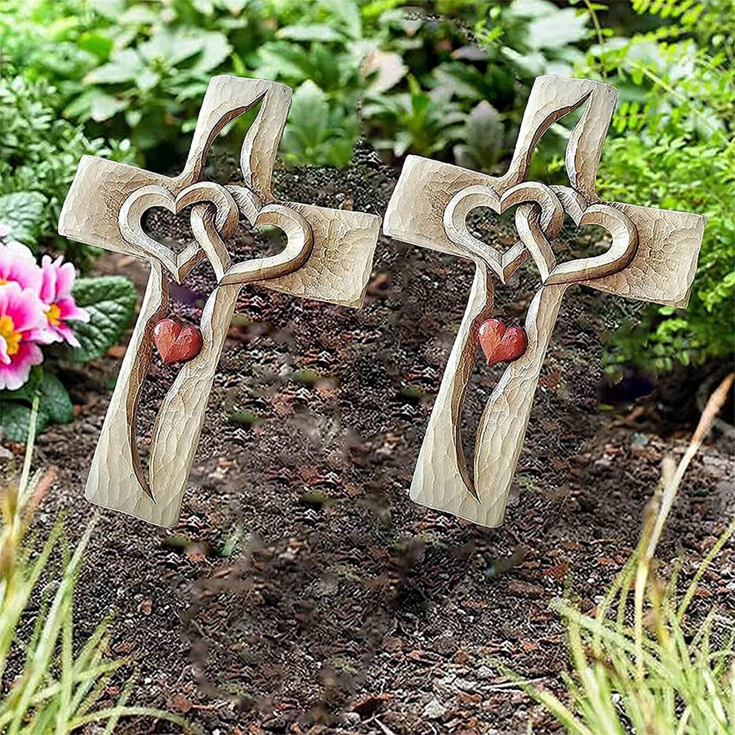Carved Wooden Cross Intertwined Hearts Acrylic Love Cross Ornaments Decorative Stakes Figurines Creative Outdoor Garden Decor
