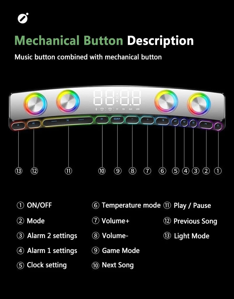 Upgrade your gaming or home theater audio setup with the SH39 Bluetooth Speaker! This speaker is packed with features that will impress any audio enthusiast. With a 3D stereo subwoofer, you'll experience immersive sound like never before. The built-in LED clock adds a stylish touch to your setup, while the dazzling colorful lighting creates a visually stunning experience.