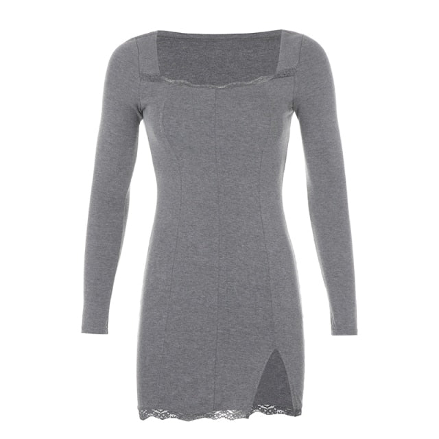 Square Neck Lace Patchwork Bodycon Black Dress Women Elegant Cotton Fashion Side Split Autumn Dress Mini Ladies Basic