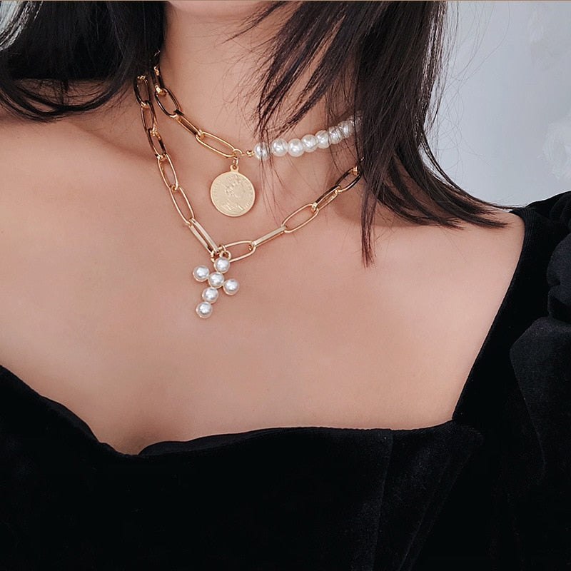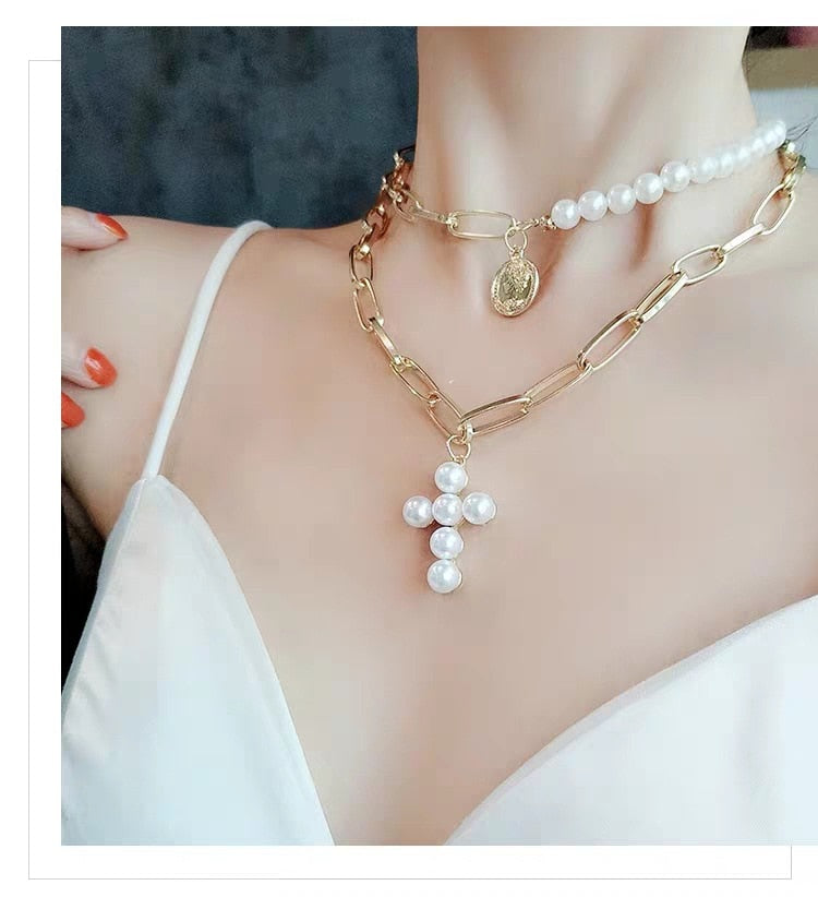 Fashion Multilayer Imitation Pearls Cross Pendant Necklaces For Women Gold Color Luxury Design Chain Necklace Jewelry Gift