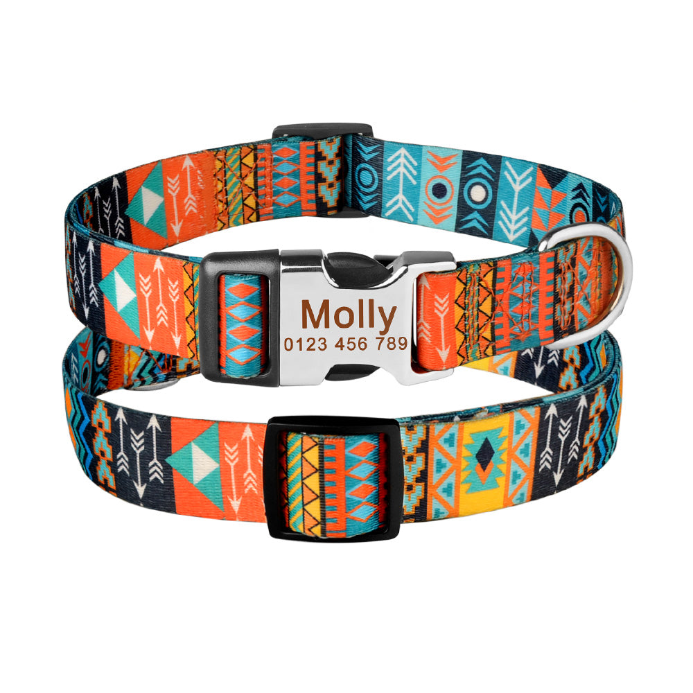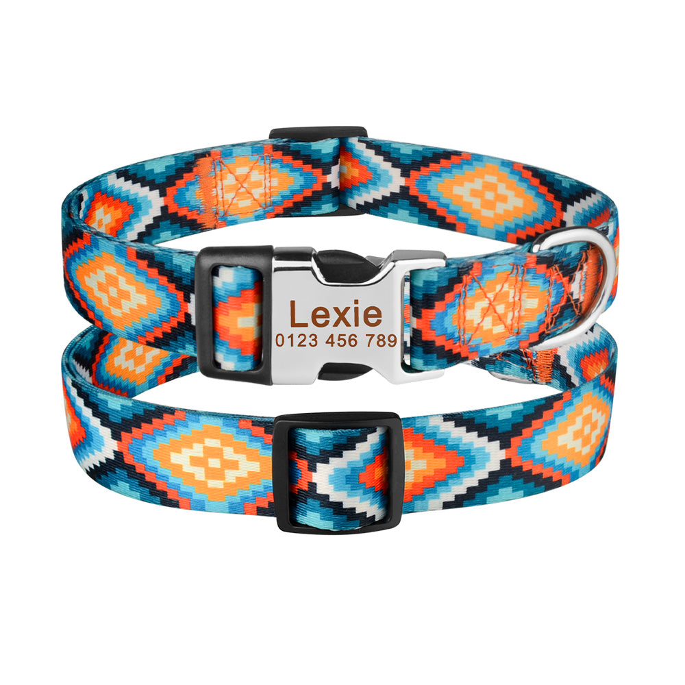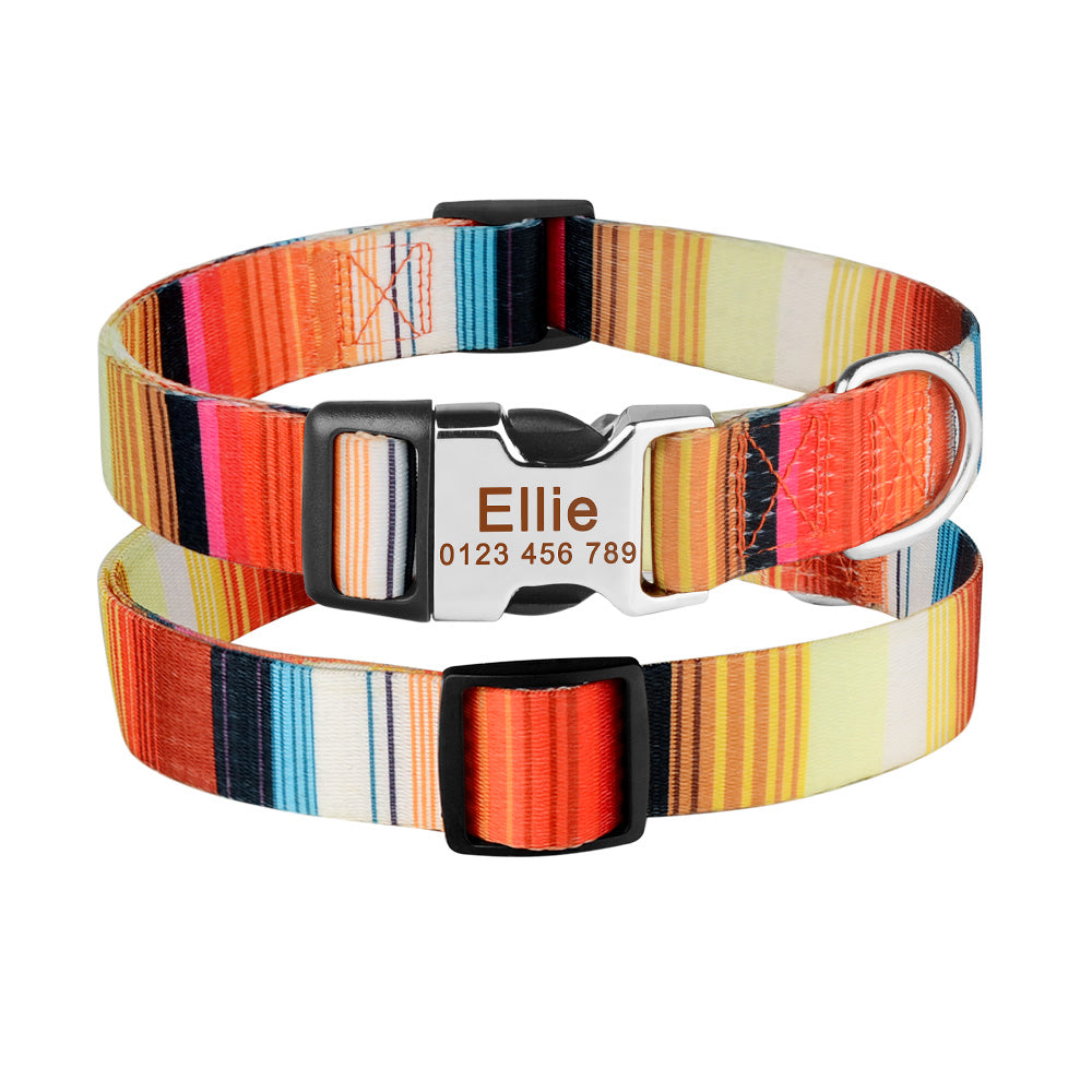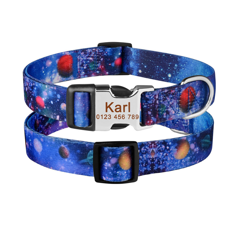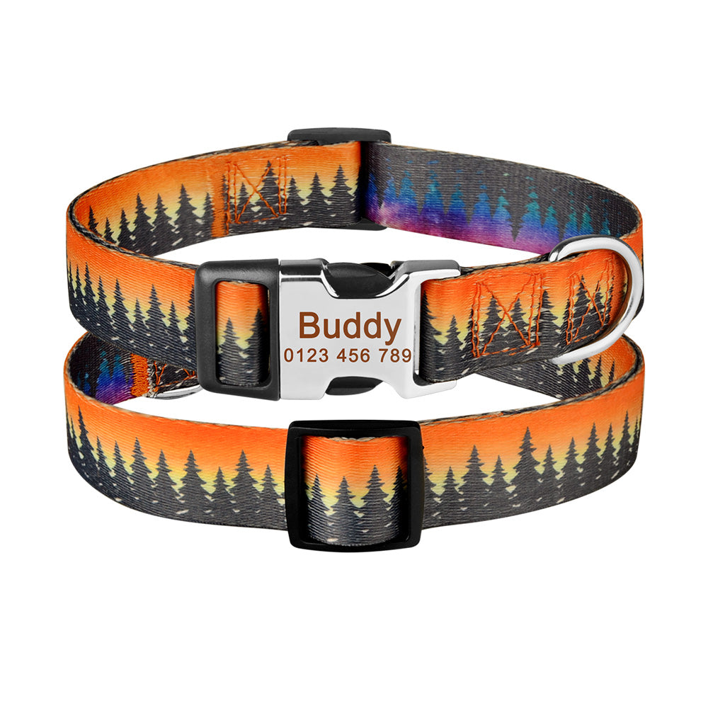 Enhance your pet's style with the Forest Pattern Polyester Cotton Printed Collar. Made from high-quality polyester, this collar is designed to provide durability and comfort. The collar is available in various vibrant colors including Blue stripe, Orange stripe, diamond pattern, Aurora Forest, Maya Mystery, Summer Beach, Milky Way, and Rainbow slide, allowing you to choose the perfect one that suits your pet's personality.