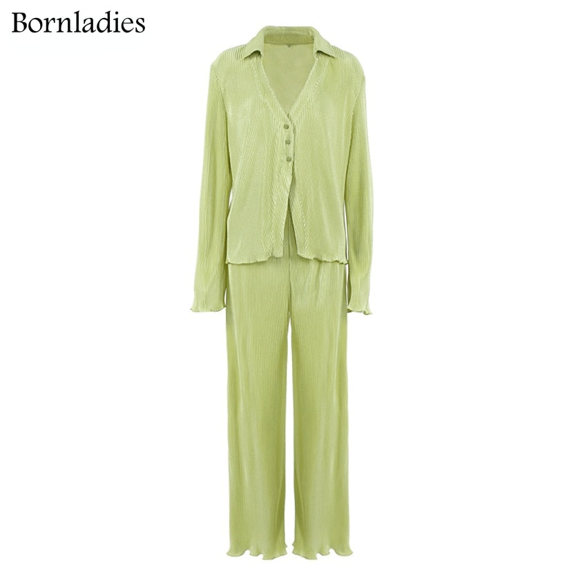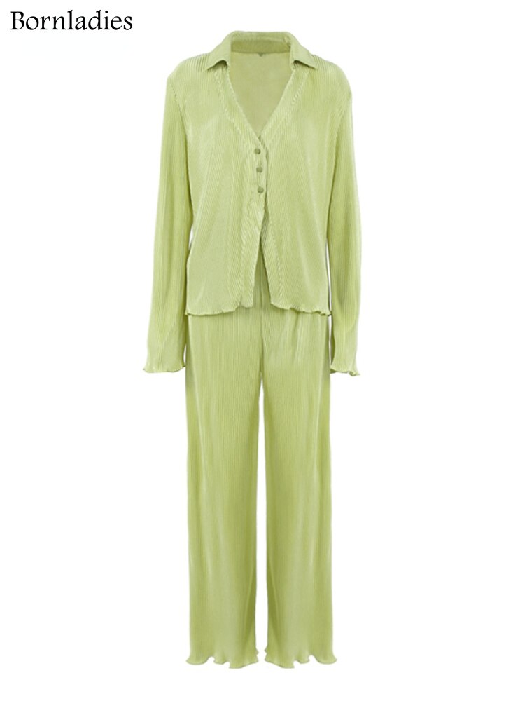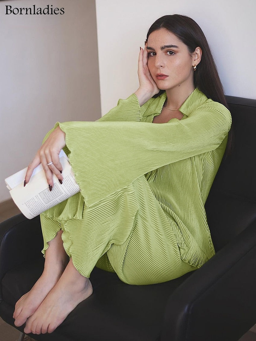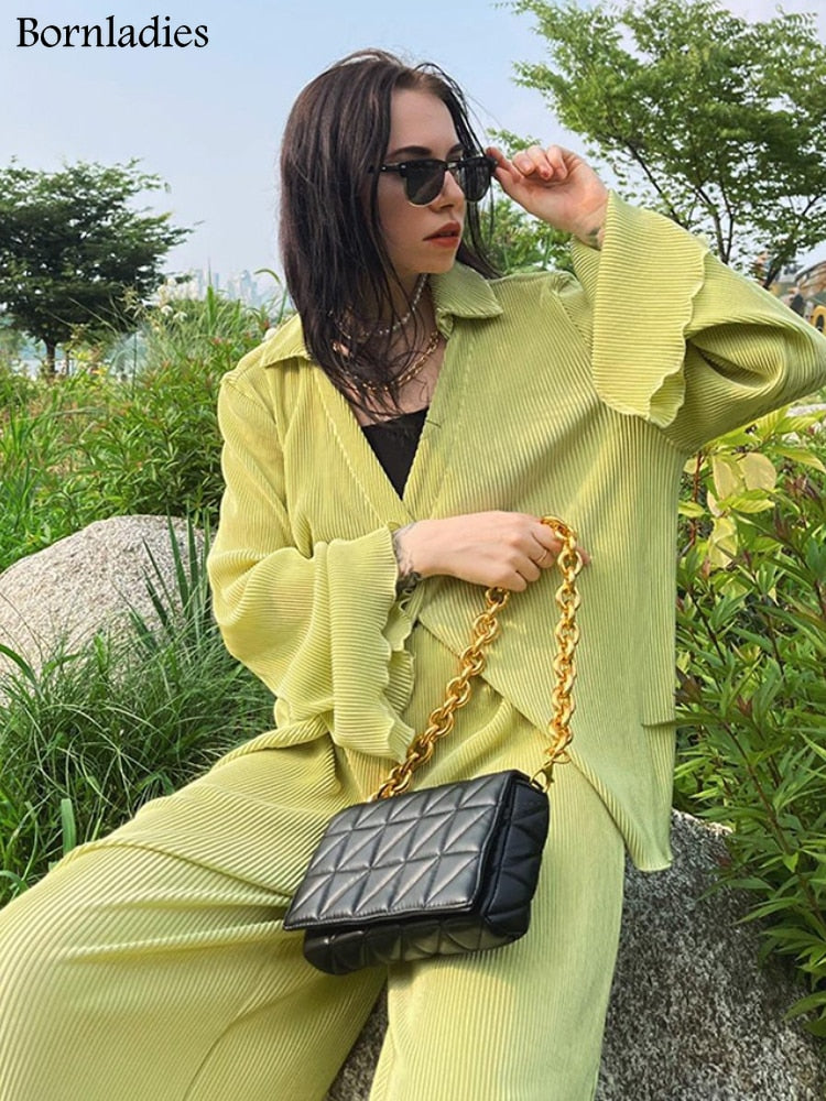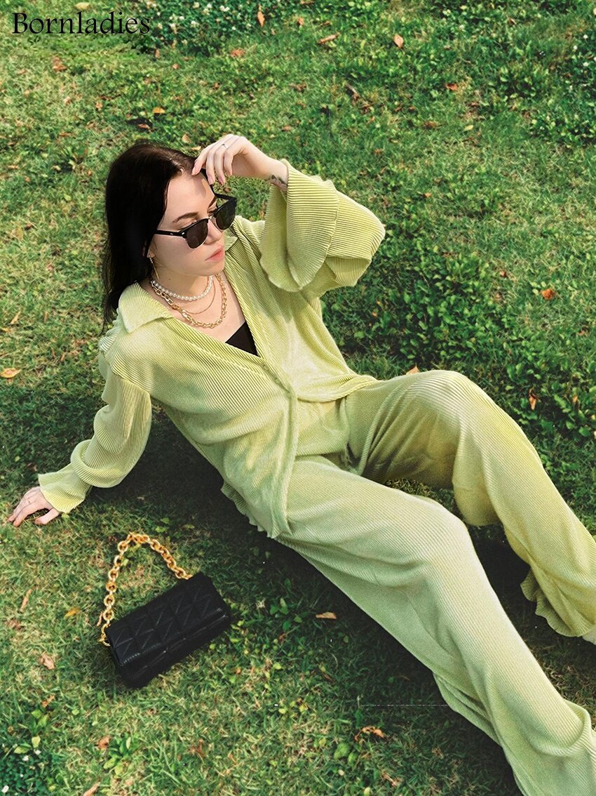Green Vintage Flare Sleeve Blouse Casual Oversize Single Breasted Blouse Woman Summer Pants Set 2 Piece Outfit