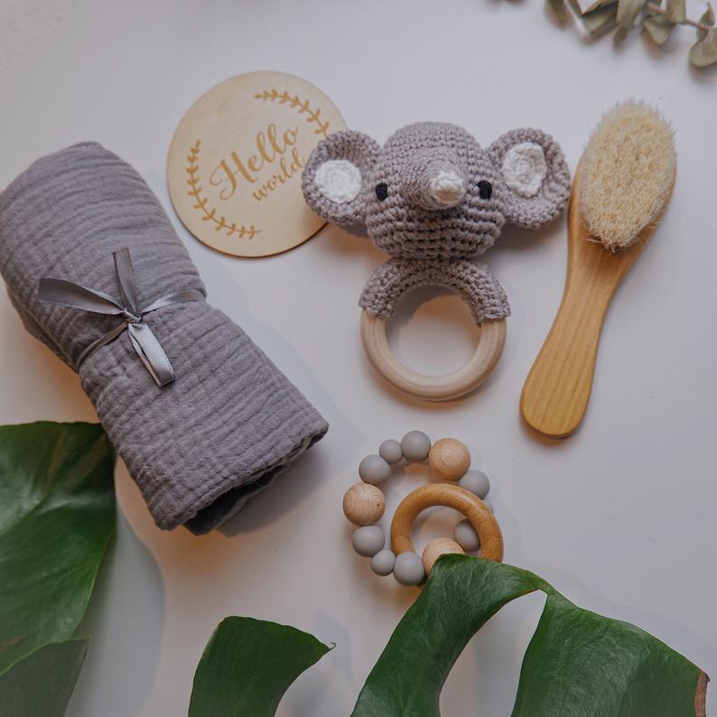 The star of our baby gift box is our handmade animal themed crochet toy rattle. This cute and cuddly toy will not only entertain your baby but also help with their sensory development. The baby muslin cloth is perfect for swaddling, burping, and wiping up any messes.