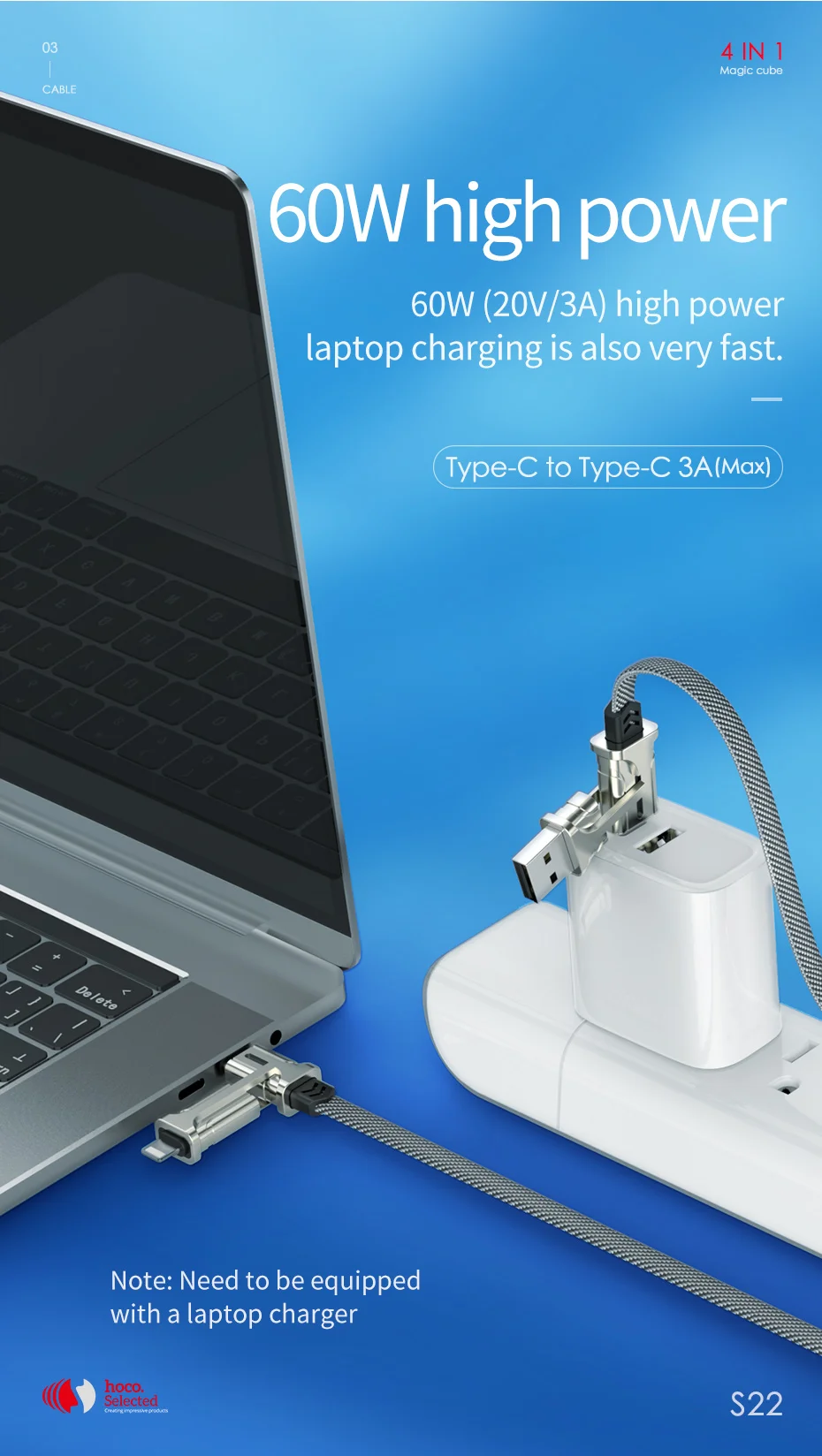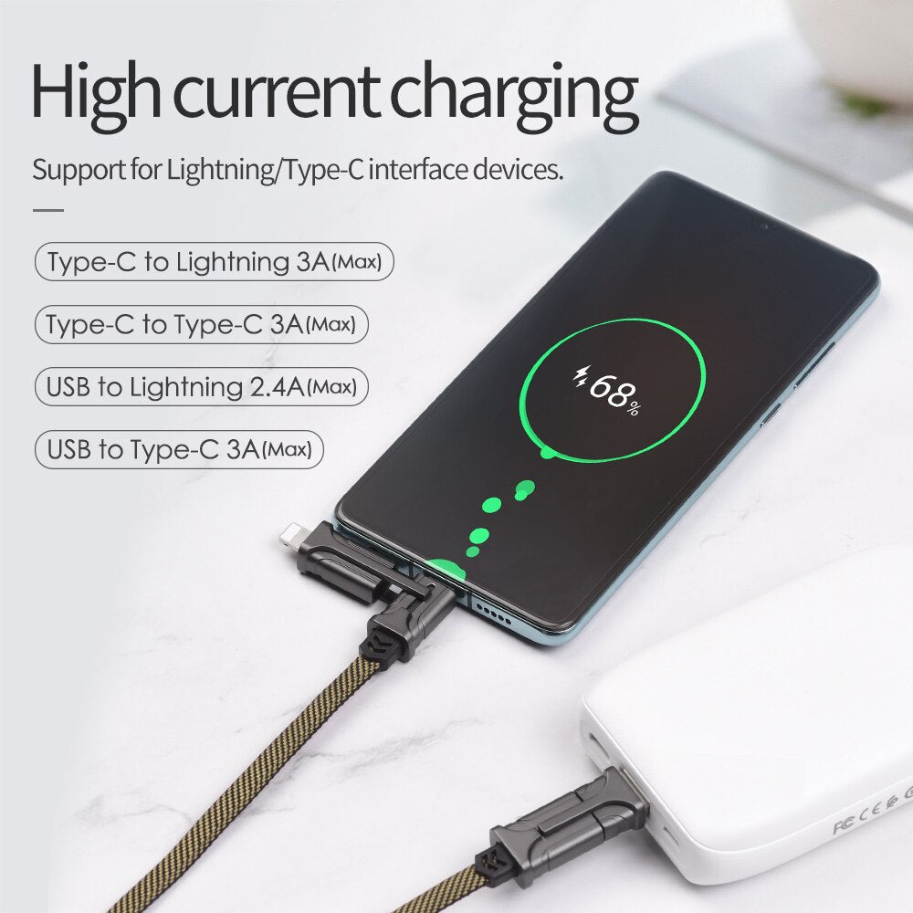 4 in 1 style cable to meet various of occasions, support USB-A to Lightning, USB-A to Type-C, Type-C to Type-C, Type-C to Lightning, can charges laptops, phones, tablets, and other Type C or Linghting interface devices, charge all devices with only one cable, no need to prepare another one.