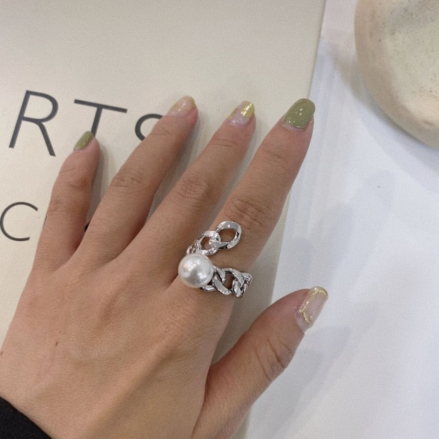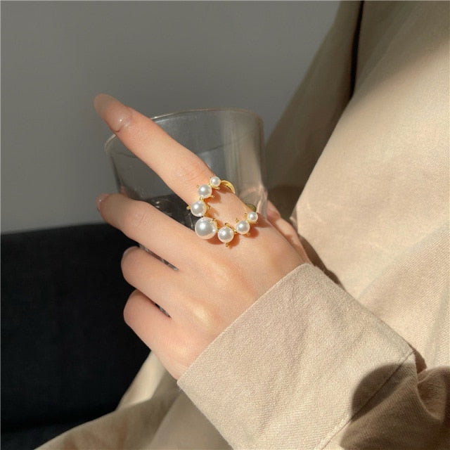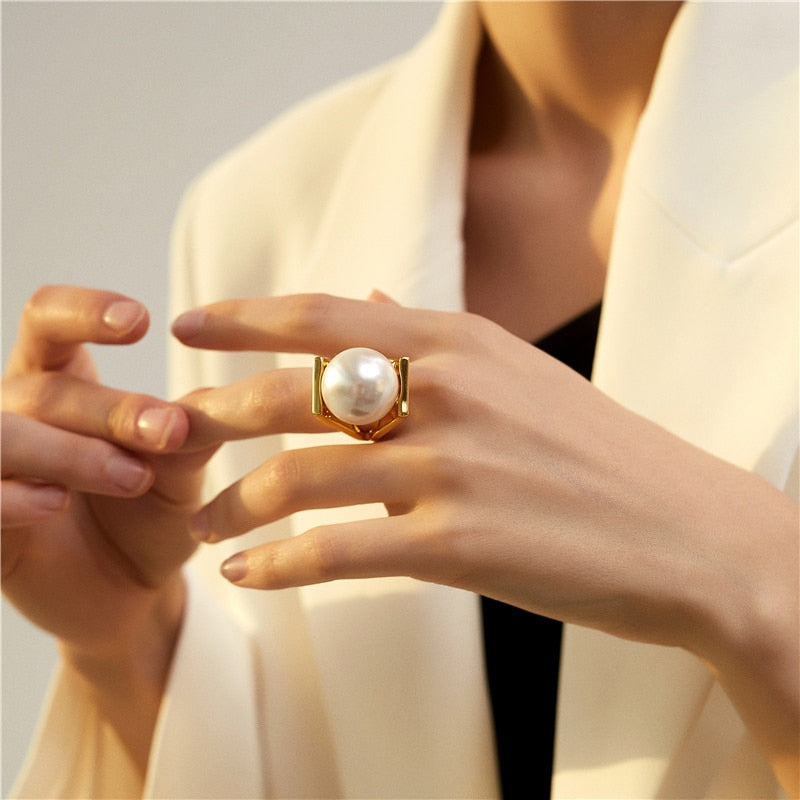 Big Imitation Pearls Gold Color Metal Hollow Exaggeration Design Finger Advanced sense Rings for Women Girls Party Gift