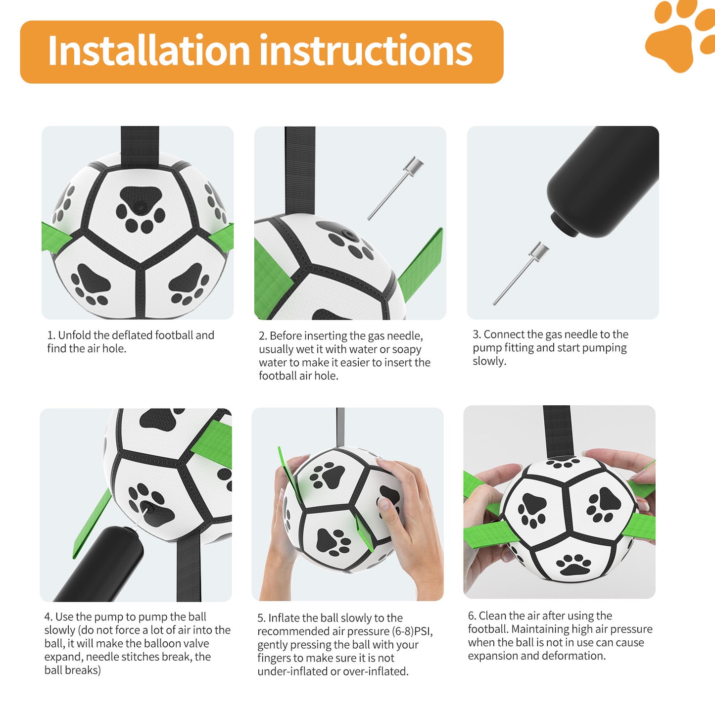 Comprehensive Package & Customer Support: Our dog ball kit includes a needle point adapter, pump, and clear instructions for easy inflation. Prioritizing customer satisfaction, our dedicated after-sale service reflects our "customer first" philosophy. Note: Limited to interactive dog toys. Elevate your dog's playtime with our versatile and thoughtfully crafted Dog Football Toy.