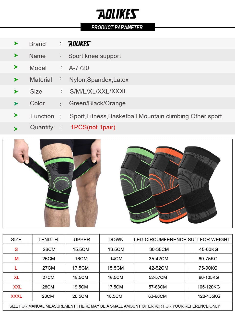 Looking for a professional knee support that's perfect for sports activities like basketball, tennis, cycling, and more? Look no further than our 1 Piece Knee Support! Made with a combination of nylon, spandex, and latex, this knee pad is soft, breathable, and offers double pressure for maximum support. It's available in a range of sizes from S to XXXL, and comes in four eye-catching colors: green, black, orange, and pink.