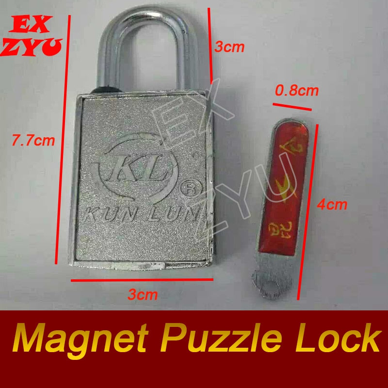This lock is widely used in real life room escape game. Room owners hide the magnet key first, players find key and aim it at the lock gap. Then put forth the strength to pull the lock.