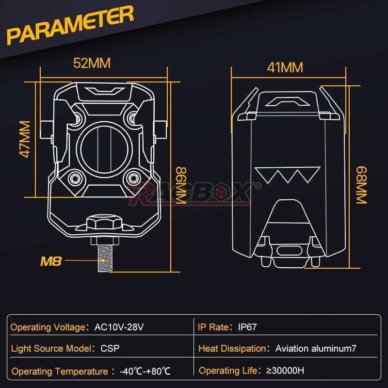 - Lighting mode: High Beam(White) and Low Beam(Yellow)