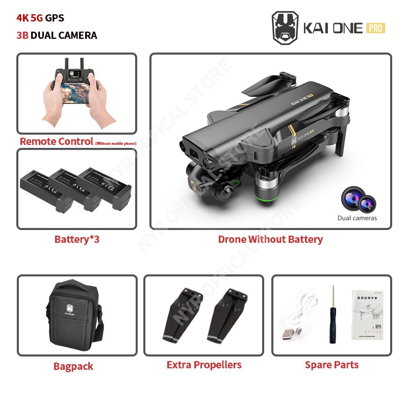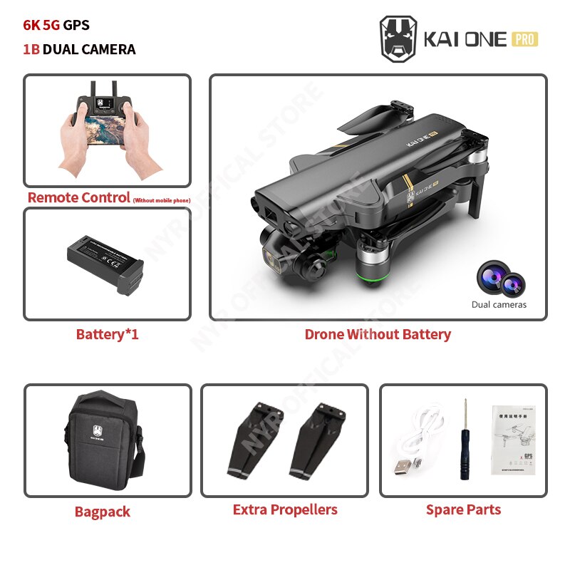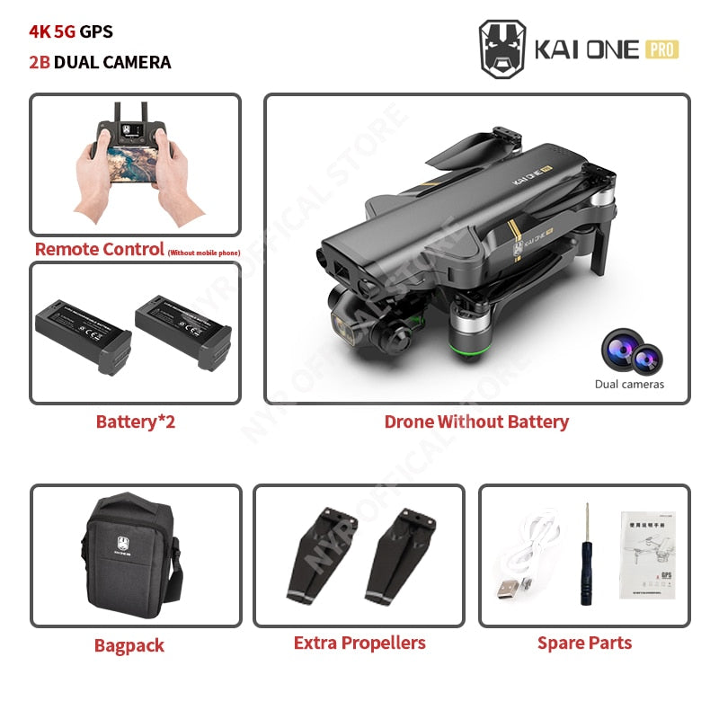 The KAI ONE Pro is made with a combination of metal, plastic, and rubber, ensuring its durability and longevity. It comes with an original box, batteries, operating instructions, remote controller, camera, USB cable, and charger, providing you with everything you need to start flying right away.