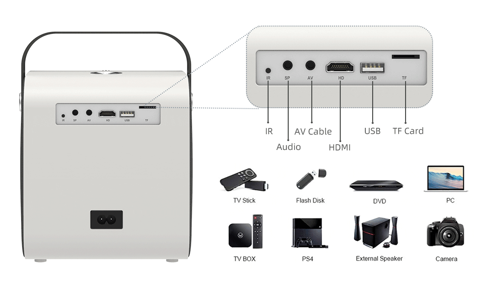 This movie projector is perfect for video viewing, TV series watching as well as photo browsing. It can be easily connected to your phone, PS3, PS4, X-Box One, or Wii to enjoy diversified games. WHEN CONNECT IT WITH YOUR PHONE, AN EXTERNAL HDMI OR MHL CABLE IS NEEDED(NOT INCLUDED IN PACKAGE).