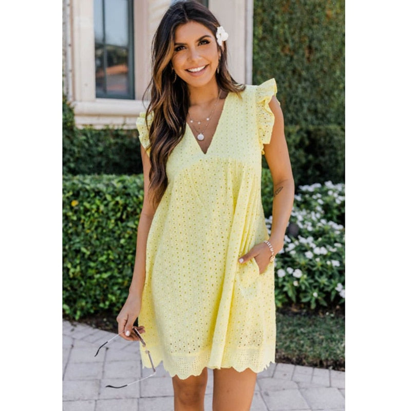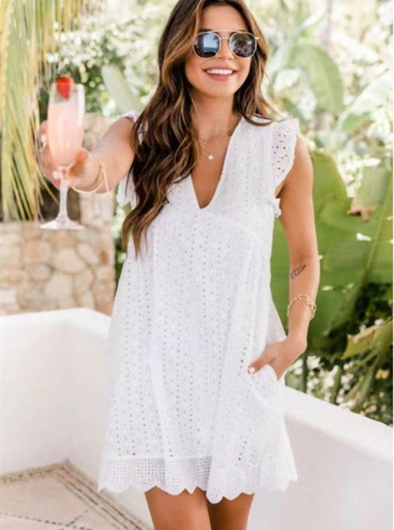 Looking for the perfect summer dress to make a statement at your next party? Look no further than our Summer Short Sleeve Lace Dress! This sexy and stylish dress features a beautiful hollow V-neck design that is sure to turn heads. The A-line silhouette and natural waistline create a flattering fit that will make you feel confident and comfortable all night long. Made from high-quality spandex and microfiber materials, this dress is both durable and comfortable to wear. With short sleeves and a mini length, it's the perfect choice for warm summer evenings. And with handy pockets, you can keep your essentials close at hand while you dance the night away. Don't miss out on this must-have addition to your wardrobe - order your Summer Short Sleeve Lace Dress today!