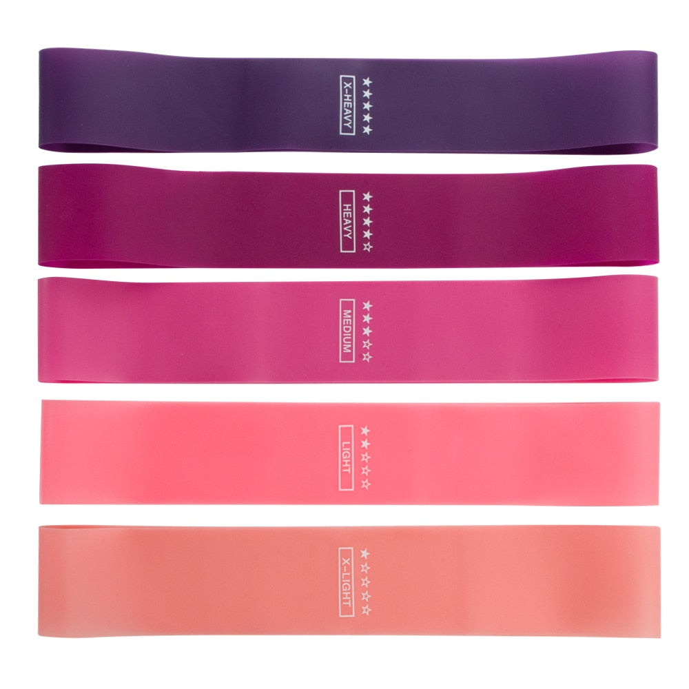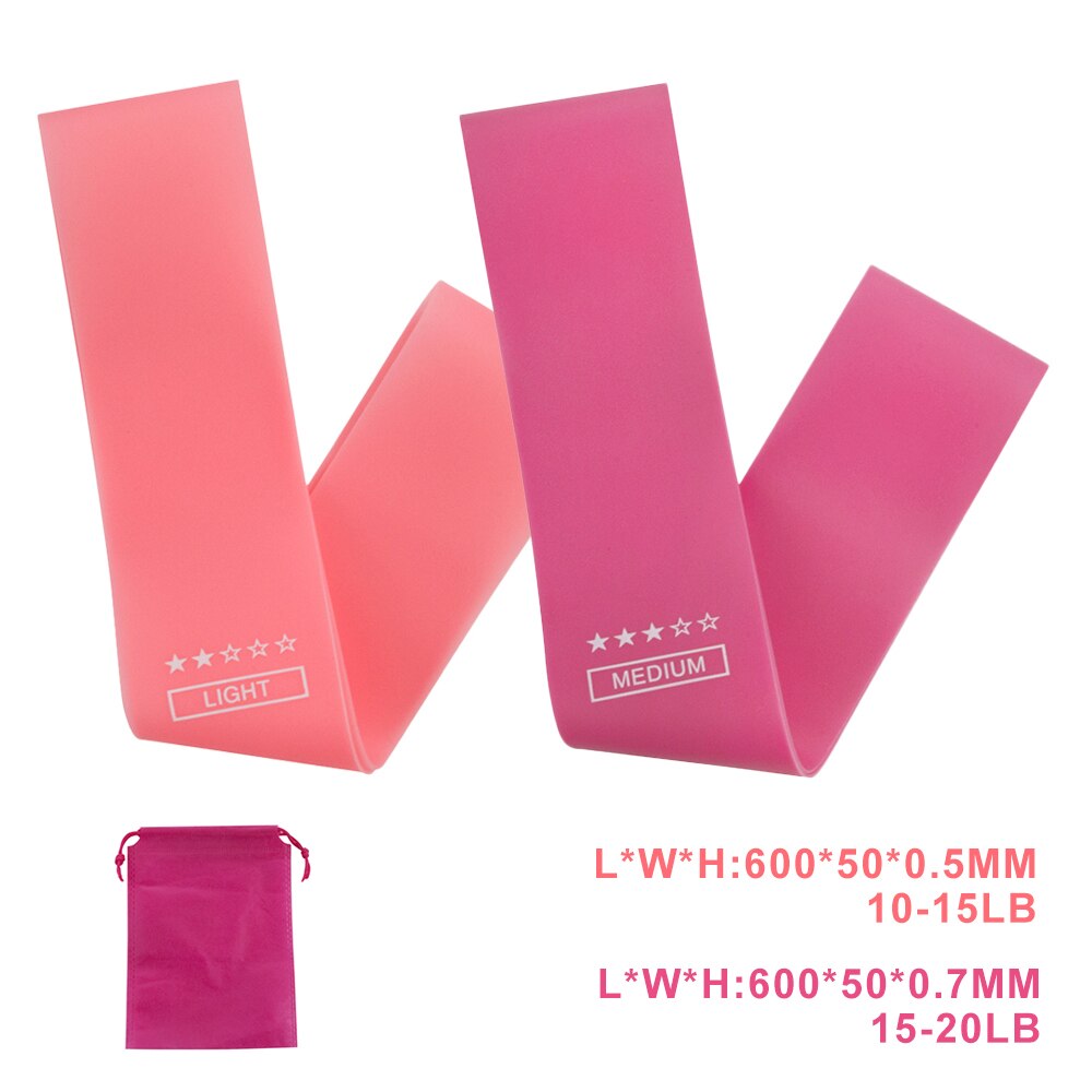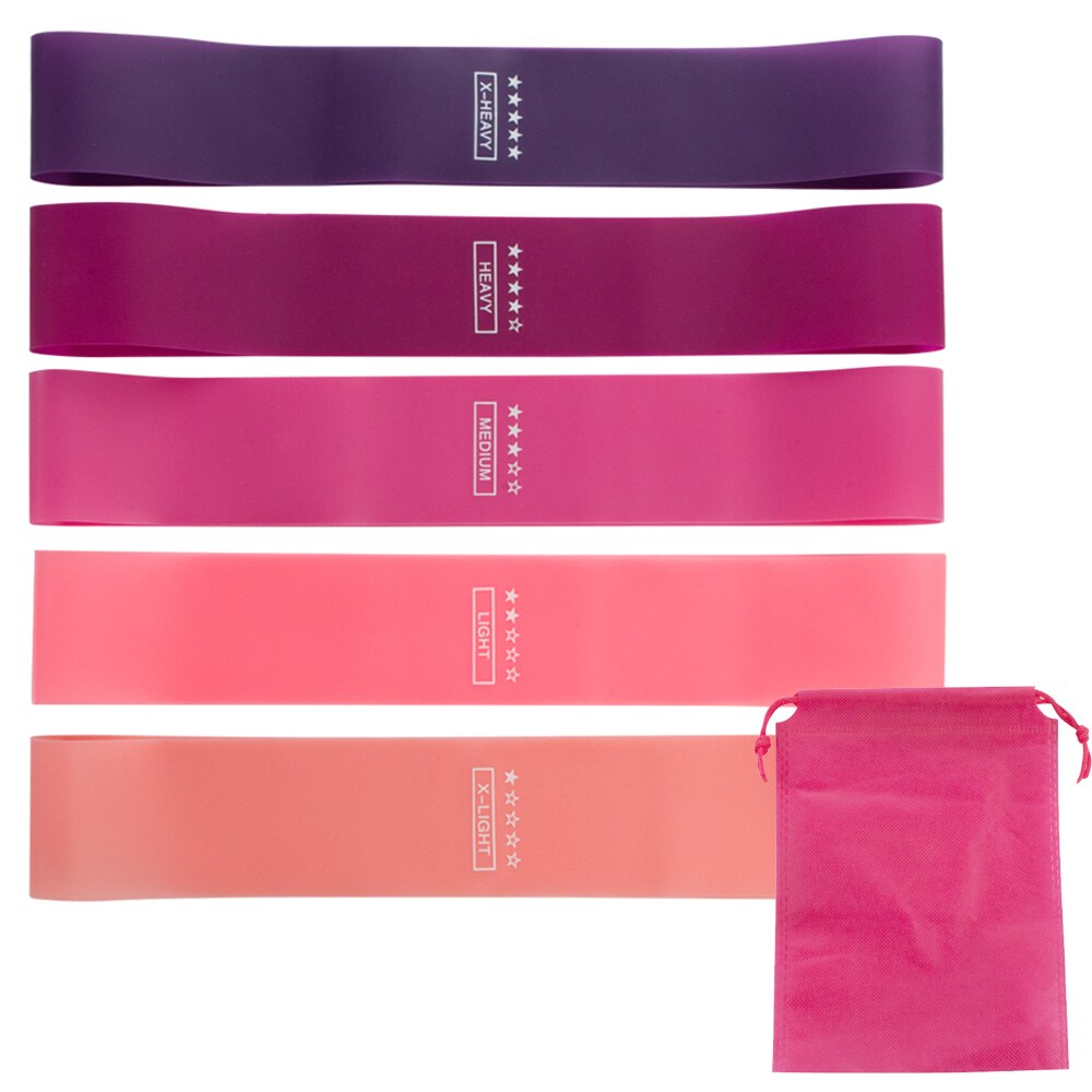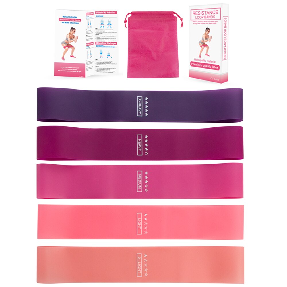 Each set includes five tension bands of varying colors and thicknesses, a cloth bag, and instructions. All of these items are neatly packaged in a color box.