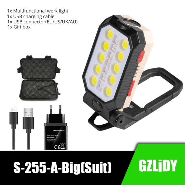 USB Rechargeable COB Work Light Portable LED Flashlight Adjustable Waterproof Camping Lantern Magnet Design with Power Display