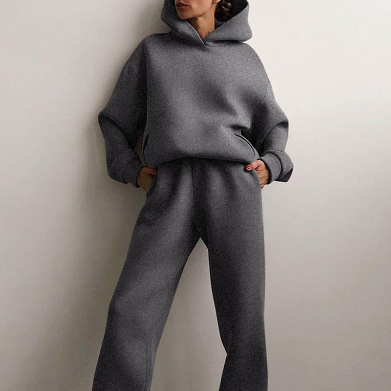 Women Tracksuit Autumn Winter Warm Solid Color Fleece Oversized Sweatshirts Female Sports Hoodie and Long Pant Two Piece Sets