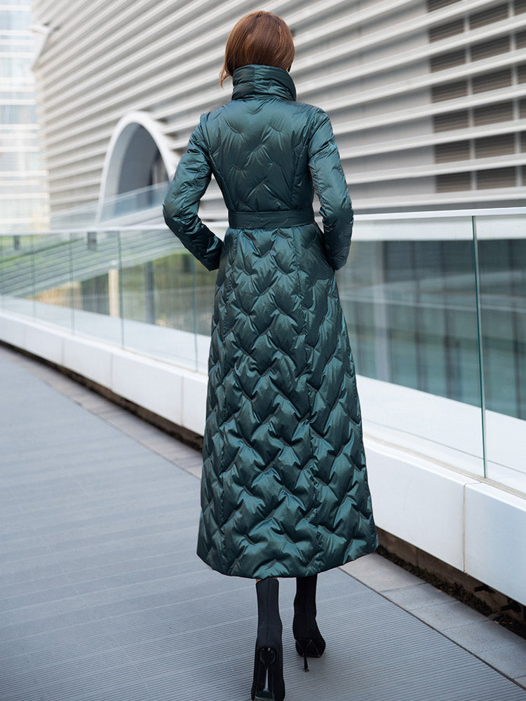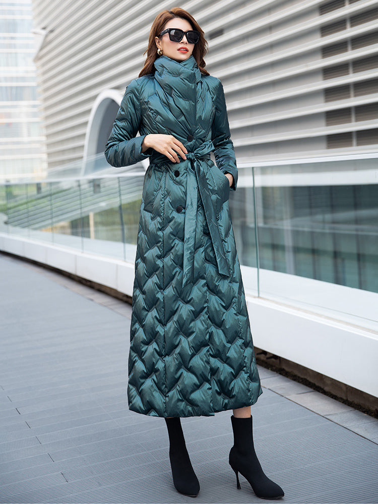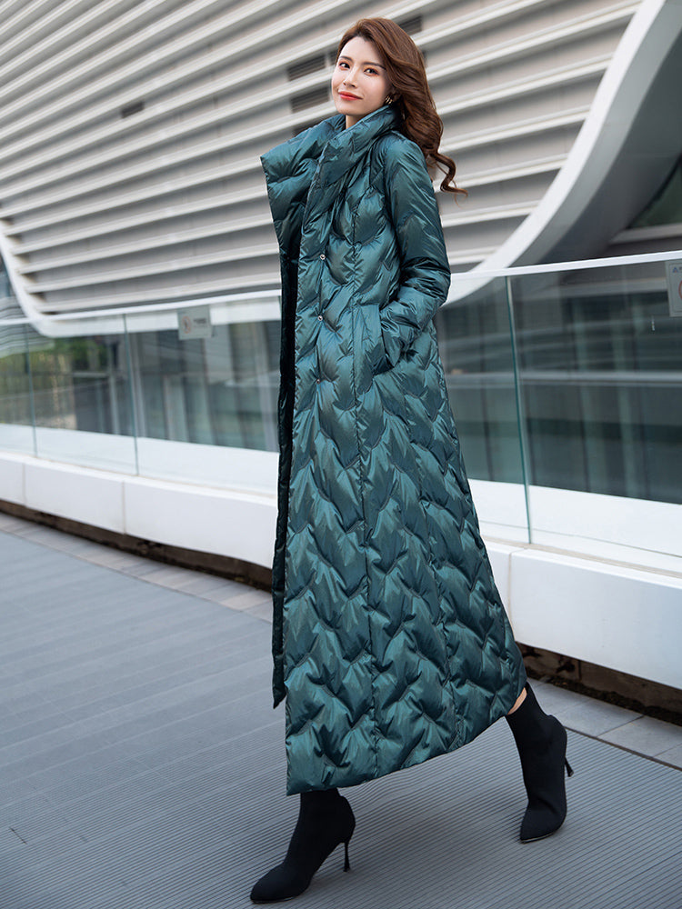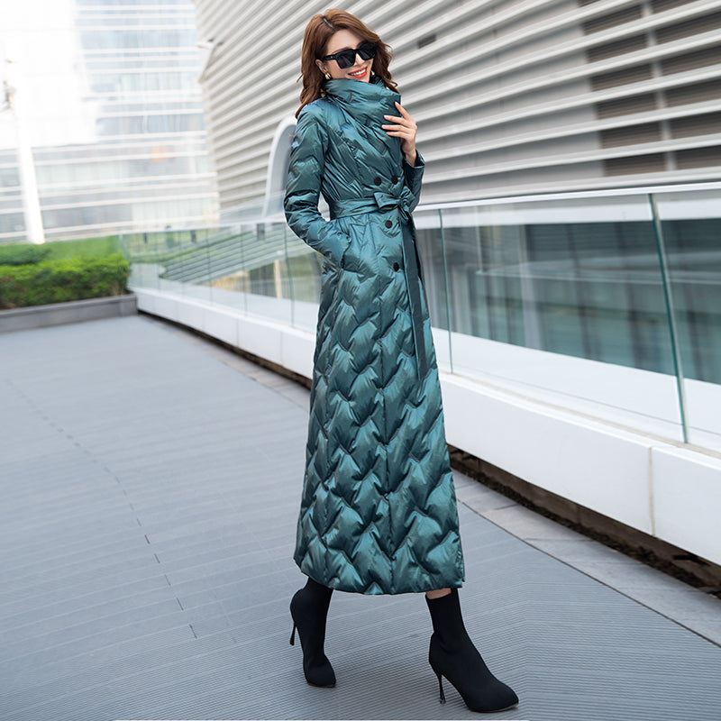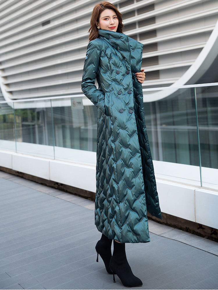 This women's long down jacket is perfect for staying warm and stylish during the winter season. The jacket features a plain pattern and a V-neck collar, adding a touch of elegance to your outfit. The double-breasted clothing placket adds a classic and sophisticated look to the jacket.